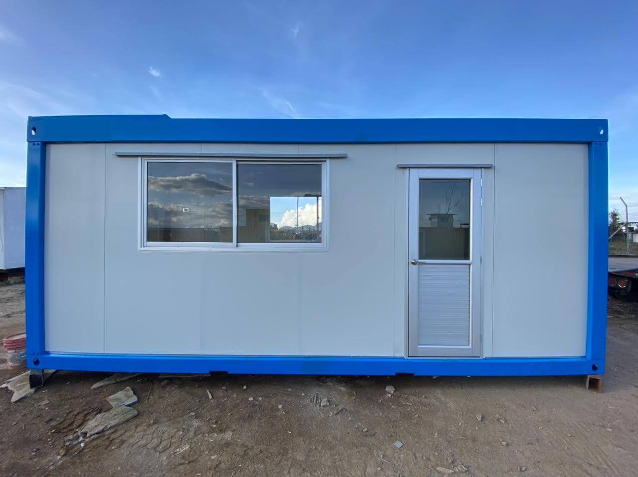 Módulos adaptados para uso comercial, puntos de venta, oficinas en obra y salas de atención, con puertas, ventanas y terminaciones interiores básicas o full.
